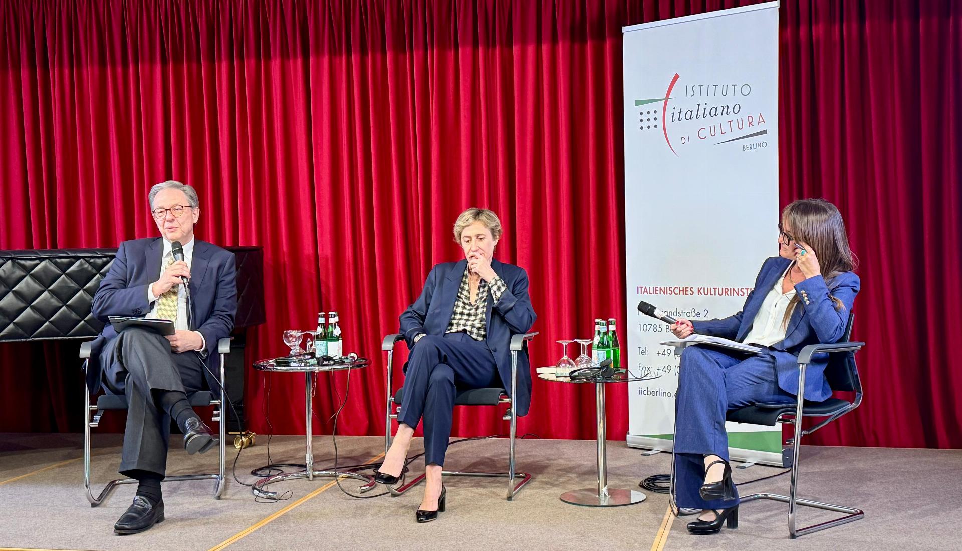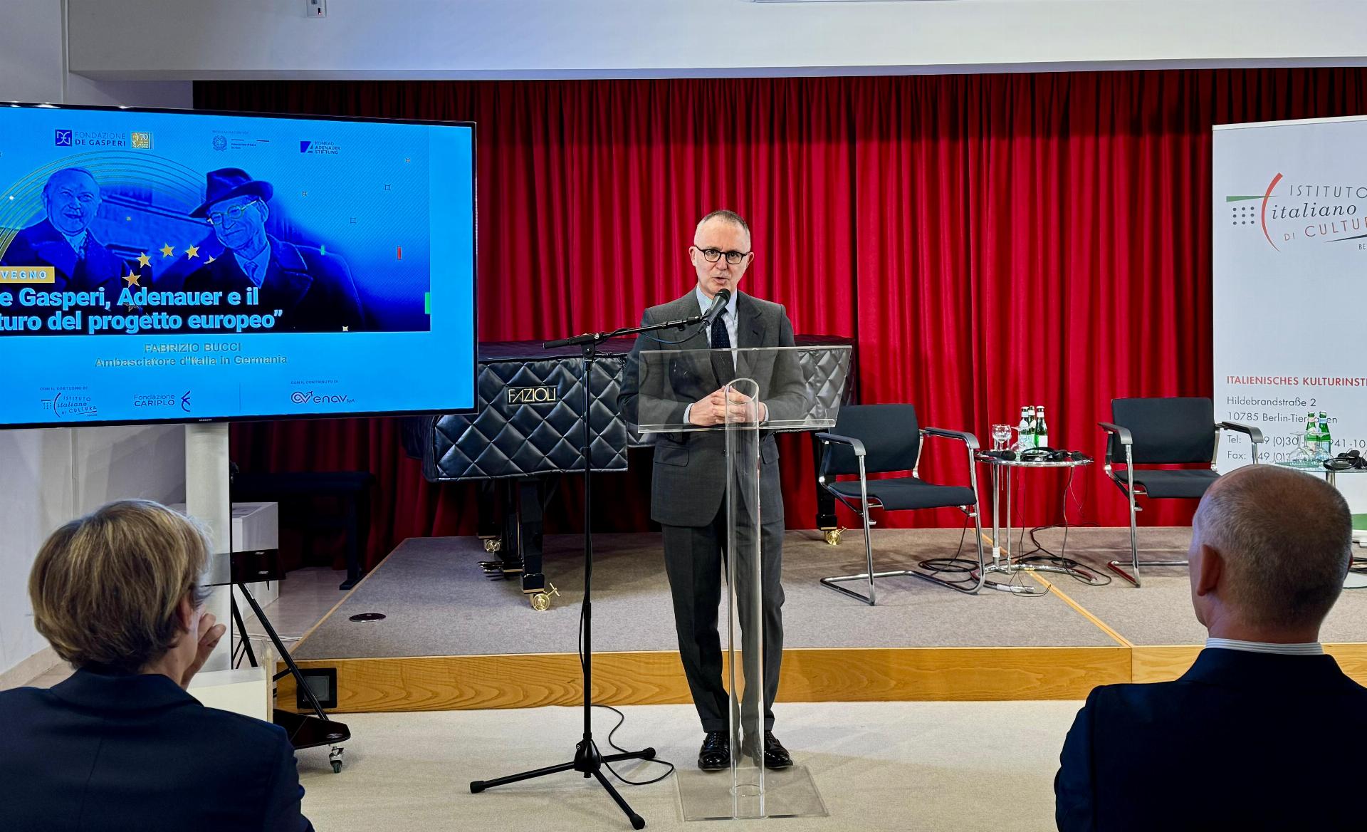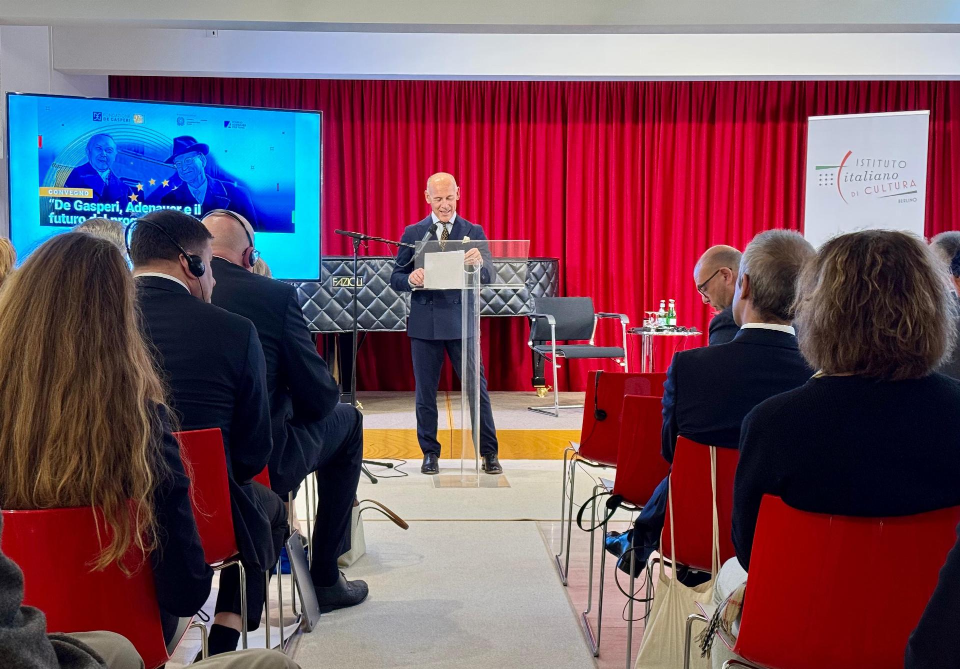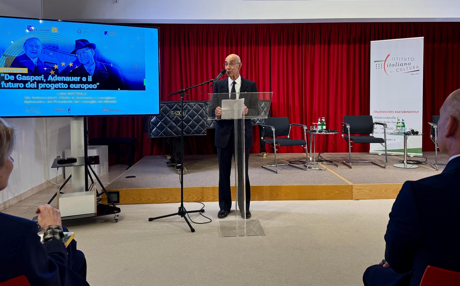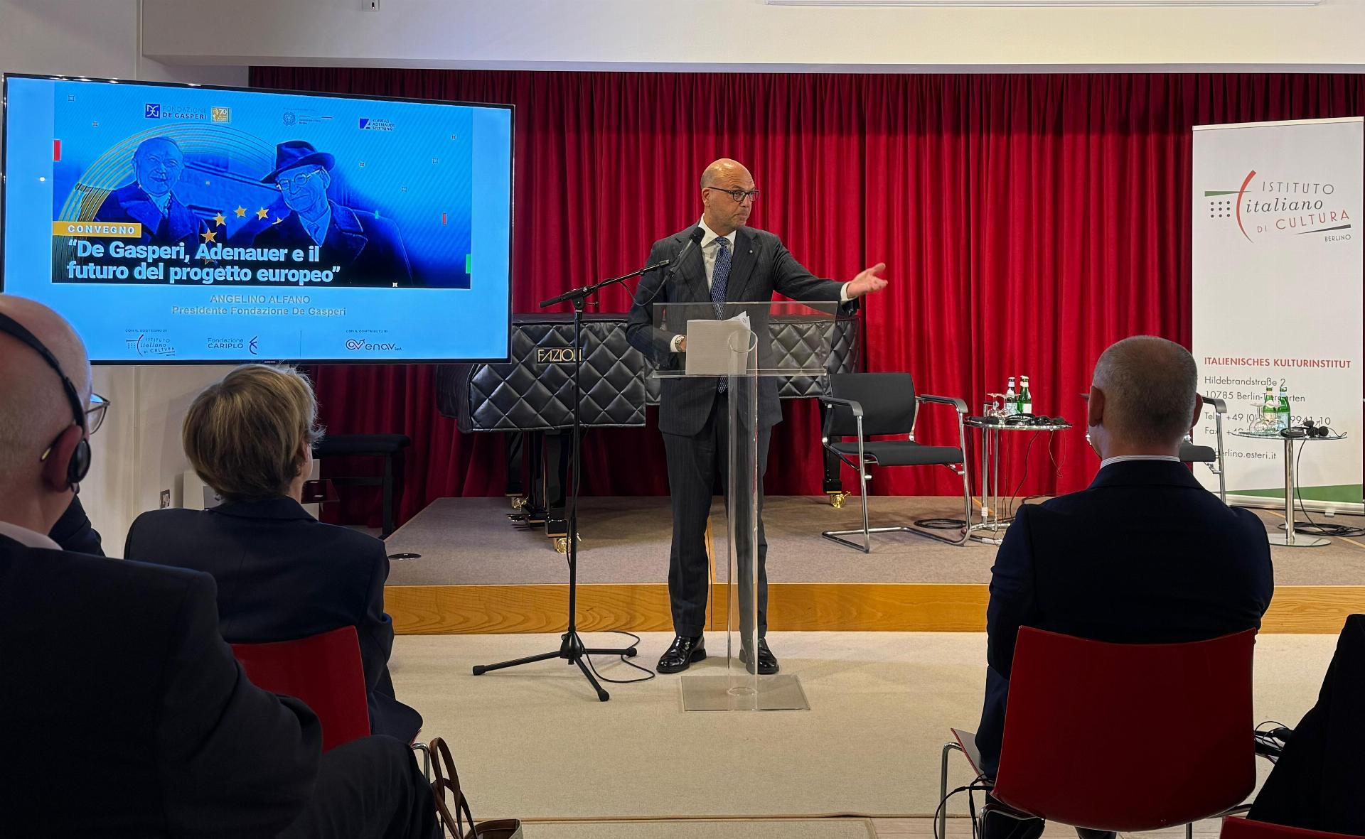Ad introdurre il convegno il Direttore dell’Istituto italiano di Cultura, Alessandro Turci, e la Direttrice della Fondazione De Gasperi, Martina Bacigalupi. La proiezione del cortometraggio “De Gasperi, visionario e costruttore” è stata accompagnata dagli interventi del Presidente della Fondazione, l’Avv. Angelino Alfano; del Policy Advisor for Italy della Konrad Adenauer Stiftung, Philipp Burkhardt; e dell’Ambasciatore Luigi Mattiolo, ex Ambasciatore a Berlino e già consigliere diplomatico dell’ex Presidente del Consiglio Mario Draghi.