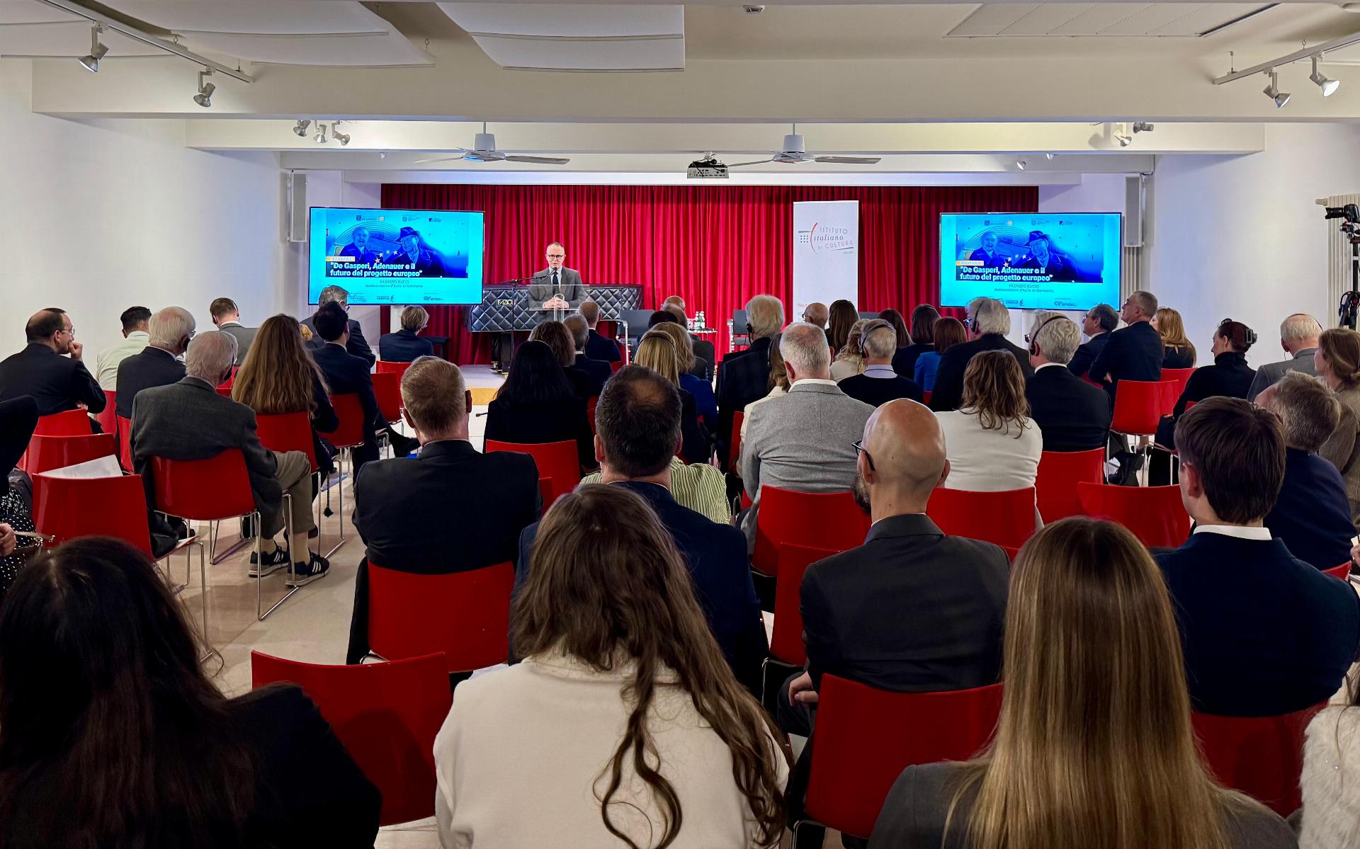 L’Ambasciatore Bucci, nella sua nota conclusiva ha sottolineato come l’eredità del pensiero pragmatico e visionario di De Gasperi e Adenauer non sia oggi solo un monumento da celebrare, bensì anche un “compito da raccogliere”, rimarcando così la rilevanza della loro lezione, che “ci invita a guardare oltre l’immediato, ad avere il coraggio della visione”. Queste due figure fondamentali “ci mostrano che l’Europa si costruisce quando i leader hanno la forza di pensare al bene comune europeo. Ci mostrano che la cooperazione tra Italia e Germania, tra i nostri due popoli, è una condizione essenziale per far avanzare l’intero progetto europeo”, così l’Ambasciatore.