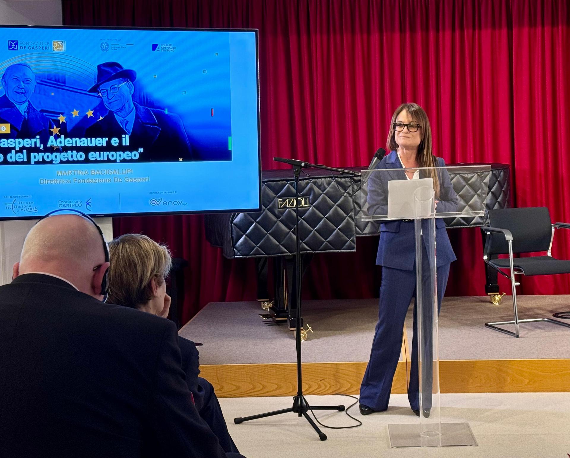 È seguita una conversazione con Mara Gergolet, Corrispondente in Germania del Corriere della Sera; Tobias Piller, ex corrispondente in Italia e attuale editorialista di Frankfurter Allgemeine Zeitung, moderata da Martina Bacigalupi. Al centro del dibattito l’attualità della visione di De Gasperi e Adenauer in un contesto internazionale che mette alla prova la coesione politica e culturale dell’Europa, un’occasione per riscoprire le radici dell’Europa unita e interrogarsi sul futuro del suo cammino politico e ideale.